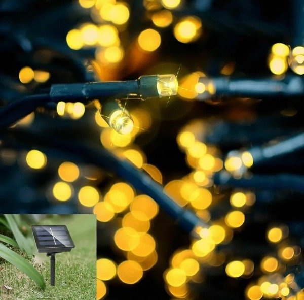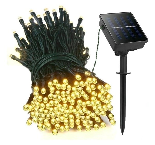 Guirnalda de arroz de luz cálida apta para exterior que se carga con un mini panel solar. No necesitas enchufes ni pilas! Ideal para que decores tu jardín, patio o galería.