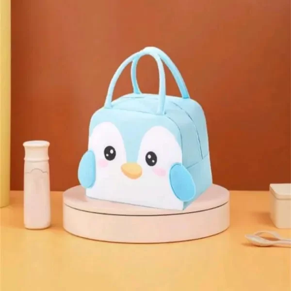 Frente impermeable estampado y detalles en felpa. Interior térmico aluminizado para conservar la temperatura de los alimentos.