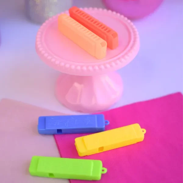 silbato de juguete de 8cm en colores surtidos, con ojal para colgar.